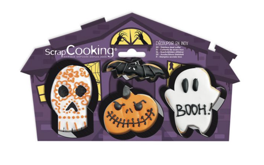 Ten zestaw od Scrapcooking zawiera 4 foremki do ciastek ze stali nierdzewnej o tematyce Halloween: 1 duch, 1 nietoperz, 1 dynia i 1 czaszka.