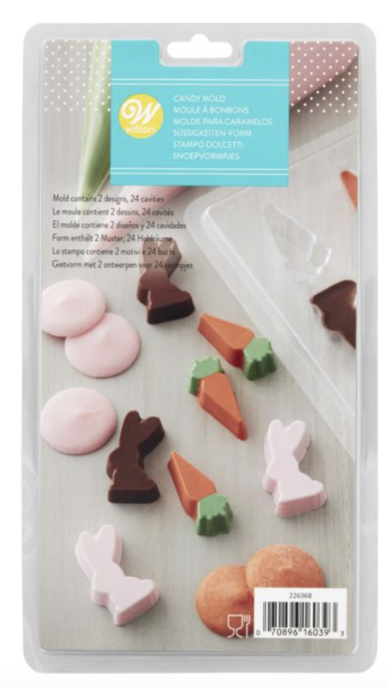 Zrób zabawne cukierki na Wielkanoc dzięki mini króliczkowi i marchewce Candy Mold firmy Wilton.
