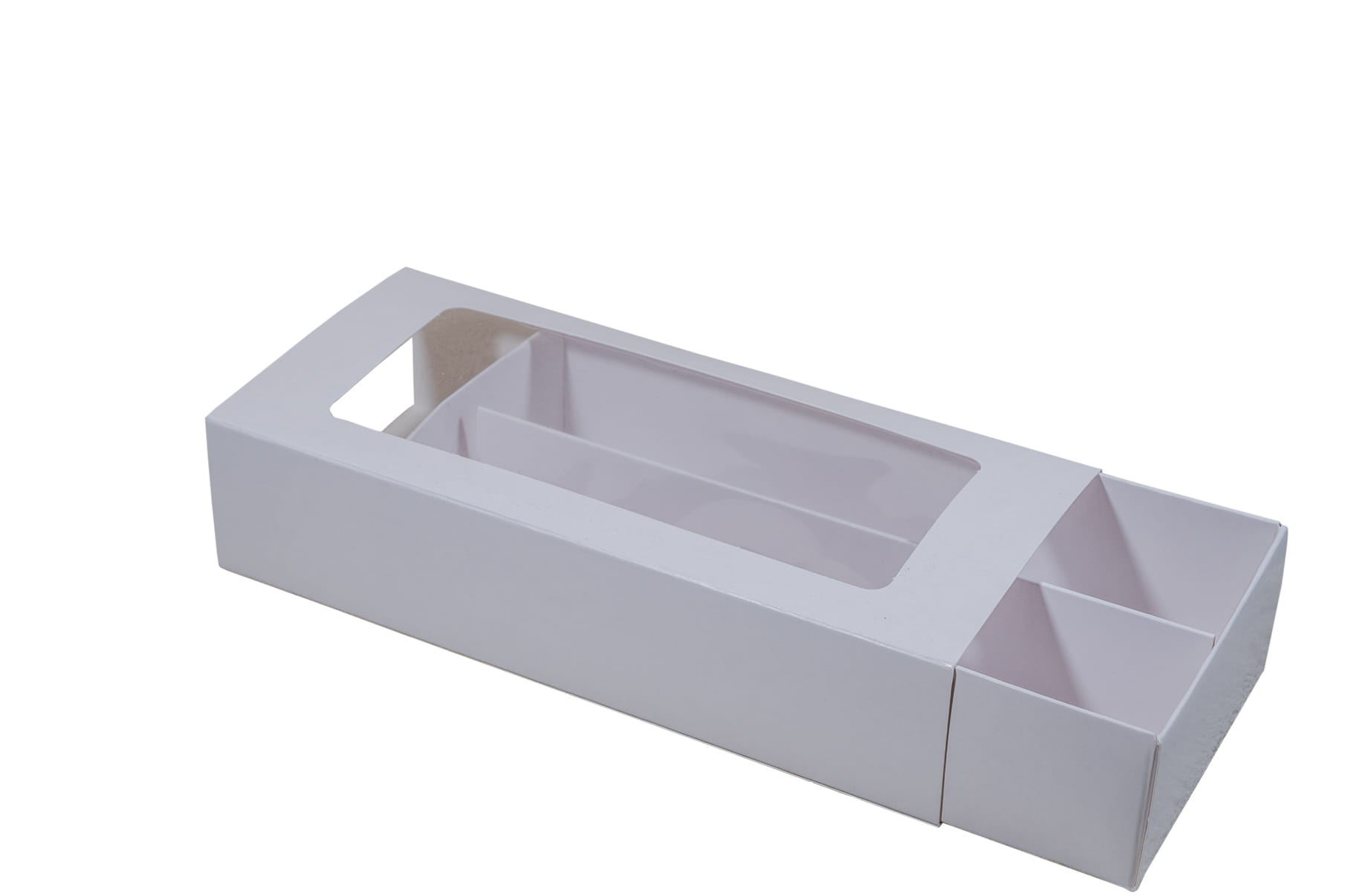 Pudełko na makaroniki duże - 20x9x4,5cm z okienkiem zasuwane z wkładaną podziałką