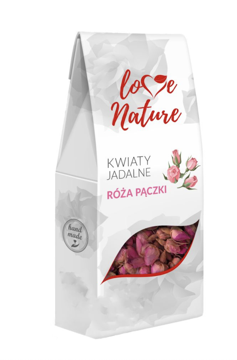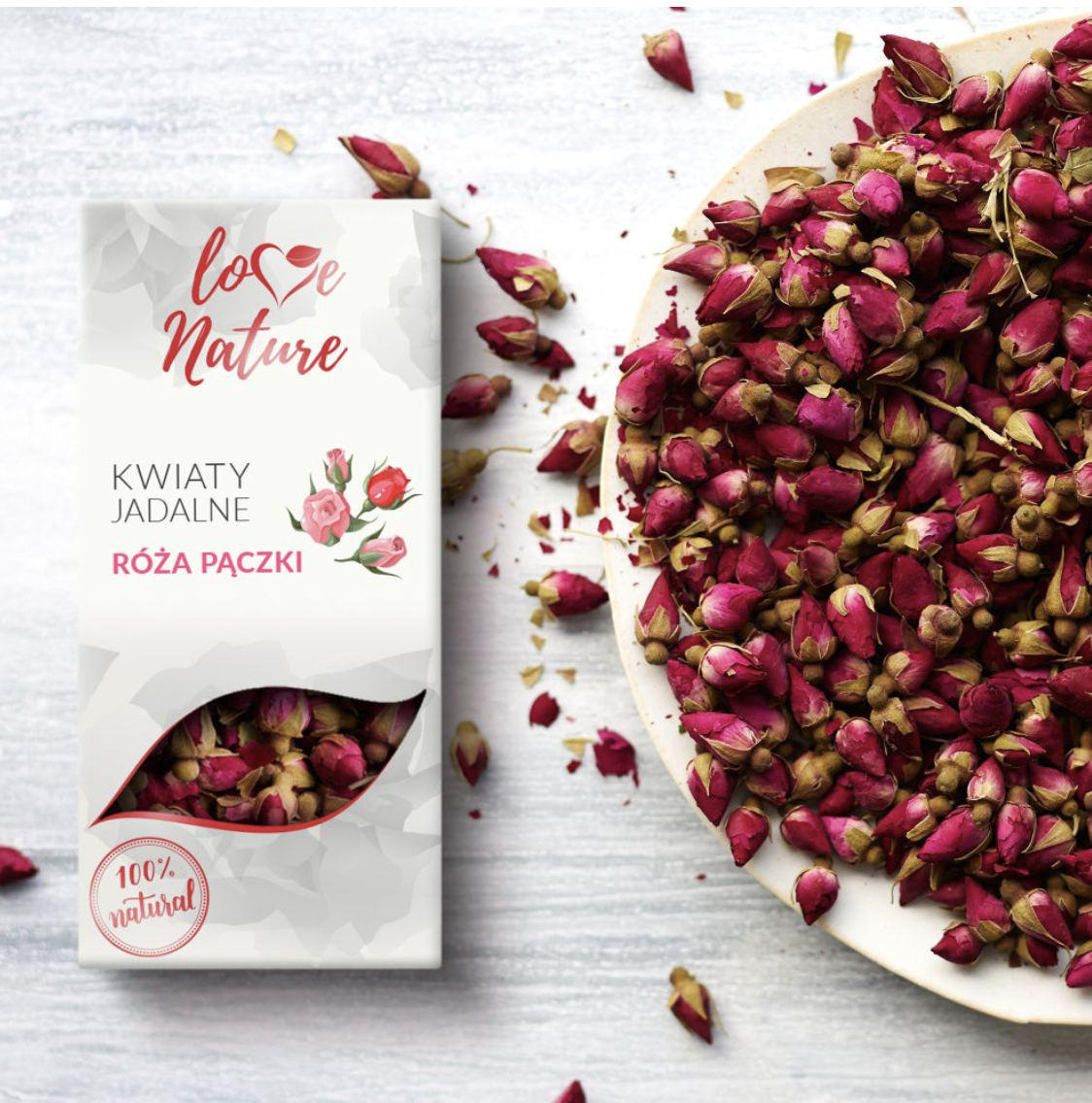 Pączki róży pięknie zdobią wypieki. Kwiaty jadalne to piękna i naturalna dekoracja, must-have w każdej kuchni. Przystroją Twoje potrawy, od dań głównych i zup, poprzez sałatki i przystawki, aż po desery i torty weselne. Zawierają witaminy, sole mineralne oraz są źródłem flawonoidów, które w organizmie człowieka działają jak antyoksydanty. Wszystko co najlepsze prosto z natury.