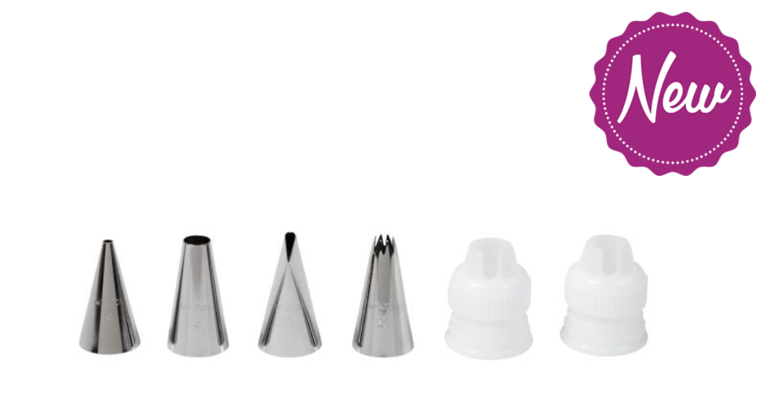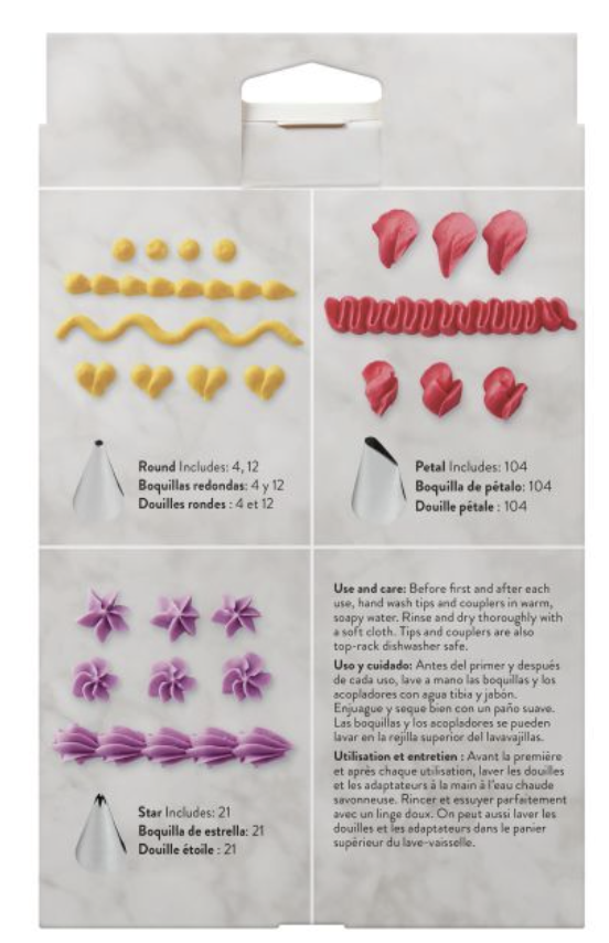 Zawiera okrągłe końcówki nr 4 i nr 12, końcówkę płatka nr 104, końcówkę gwiazdy nr 21, dwa standardowe łączniki, 12 jednorazowych worków cukierniczych i instrukcje